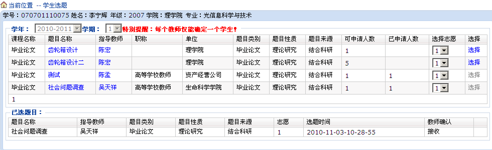 学生在题目的后面点击“选择”来完成选题操作,学生已选的题目在下面的列表栏显示,亦可点击后面的“退选”按钮退选该题目。同时学生还可通过