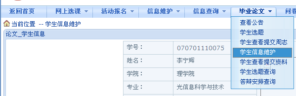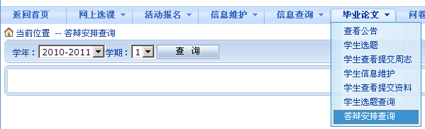 学生通过该功能查看自己的毕业答辩安排情况,菜单如下: