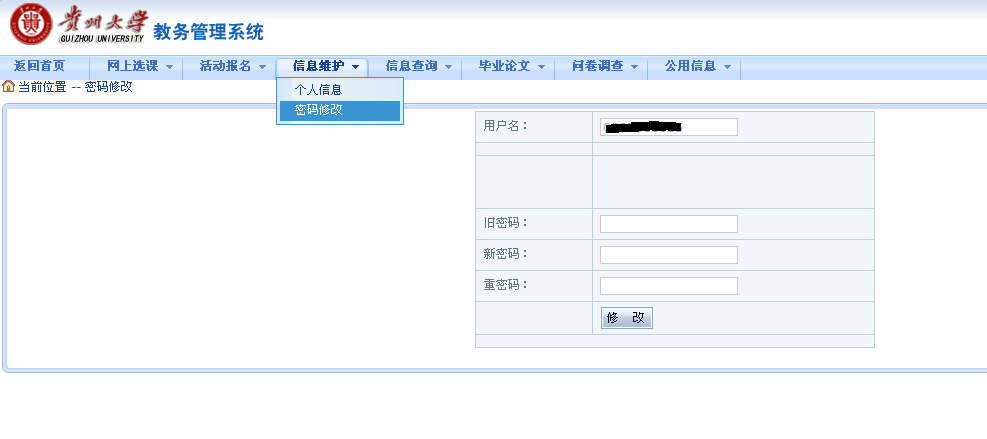 登录系统以后,先把自己的密码修改,在信息维护——密码修改