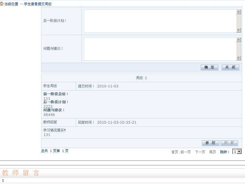 学生可以提交周志,同时可以查看老师对周志的回复,和老师的留言。