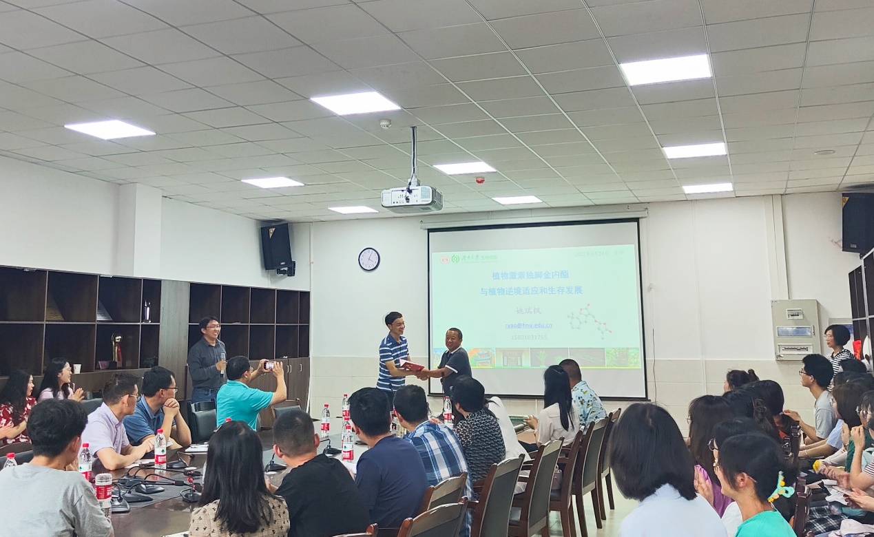 青年兴则国家兴,青年强则国家强,青年独立则民族独立。青春孕育时代希望,青年创造时代华章。2022年6月24(周五)下午16:00,在beat365手机版官方网站324学术报告厅,为拓展青年一代师生学术视野,培养科研兴趣,寻求科研突破和创新,beat365手机版官方网站组织了一期“生命科学新高地青年学者讲座”。应王旭初教授邀请,湖南大学生物学院教授、博士生导师、副院长、国家高层次青年人才姚瑞枫博士开展一场主题为“植物激素独脚金内酯与植物逆境适应和生存发展”的学术报告。院党委书记任登鸿、副院长谭艾娟、副院长胡国雄、生科院部分师生参加了本次学术交流会。会议由胡国雄副院长主持。