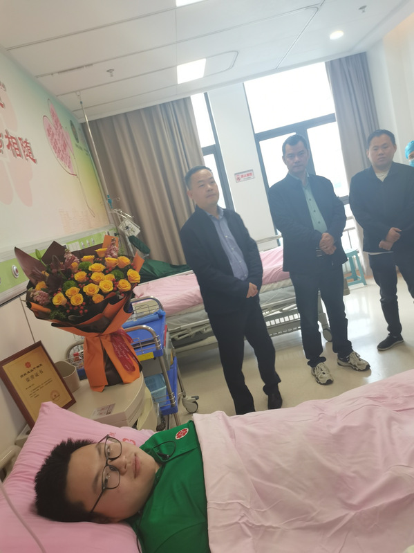 当天上午,省红十字会党组成员、专职副监事长戴世驹,beat365手机版官方网站党委书记徐进到捐献现场看望小朱,为他颁发了捐献造血干细胞荣誉证书,并献上鲜花,对其大爱行为表示感谢。