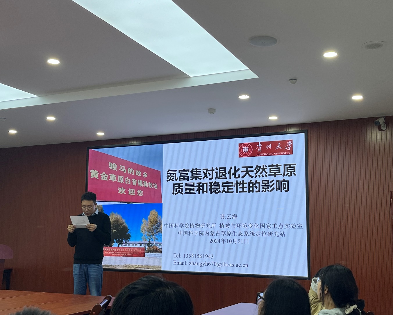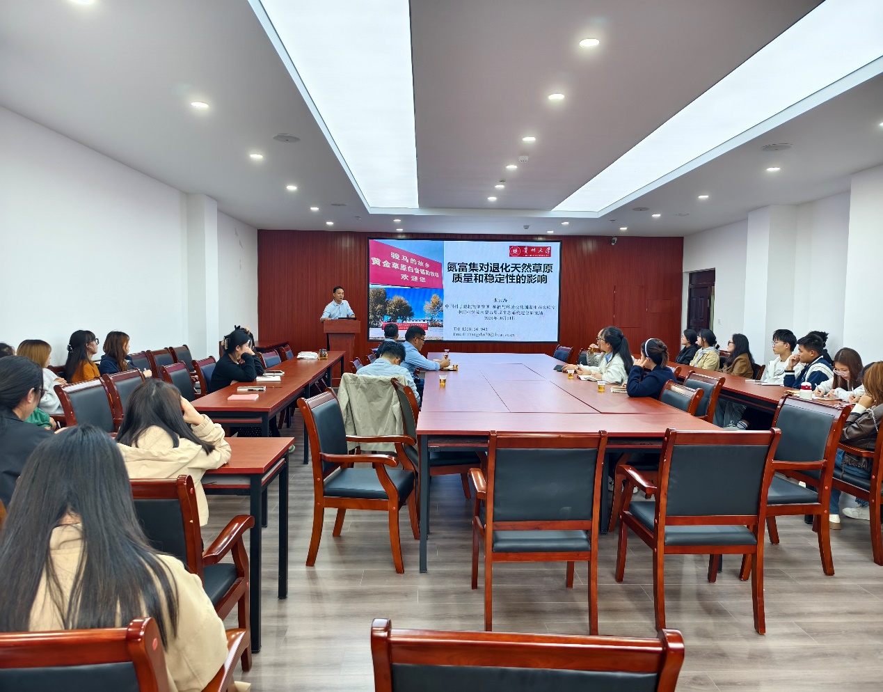 为加强师生之间的学术交流,活跃学术氛围,增强科研动力,2024年10月21日下午,beat365手机版官方网站开展了学术交流讲座,有幸邀请到中国科学院植物研究所植被与环境变化重点实验室研究员、博士生导师、北方草地生态学与可持续发展研究团队负责人,中国植物学会副秘书长张云海研究员在生科院324学术报告厅作了题为“氮富集对退化天然草原质量和稳定性的影响”的学术报告。参加本次学术交流讲座。beat365官网报告由副院长胡国雄主持,及生态系师生参加本次学术讲座。
