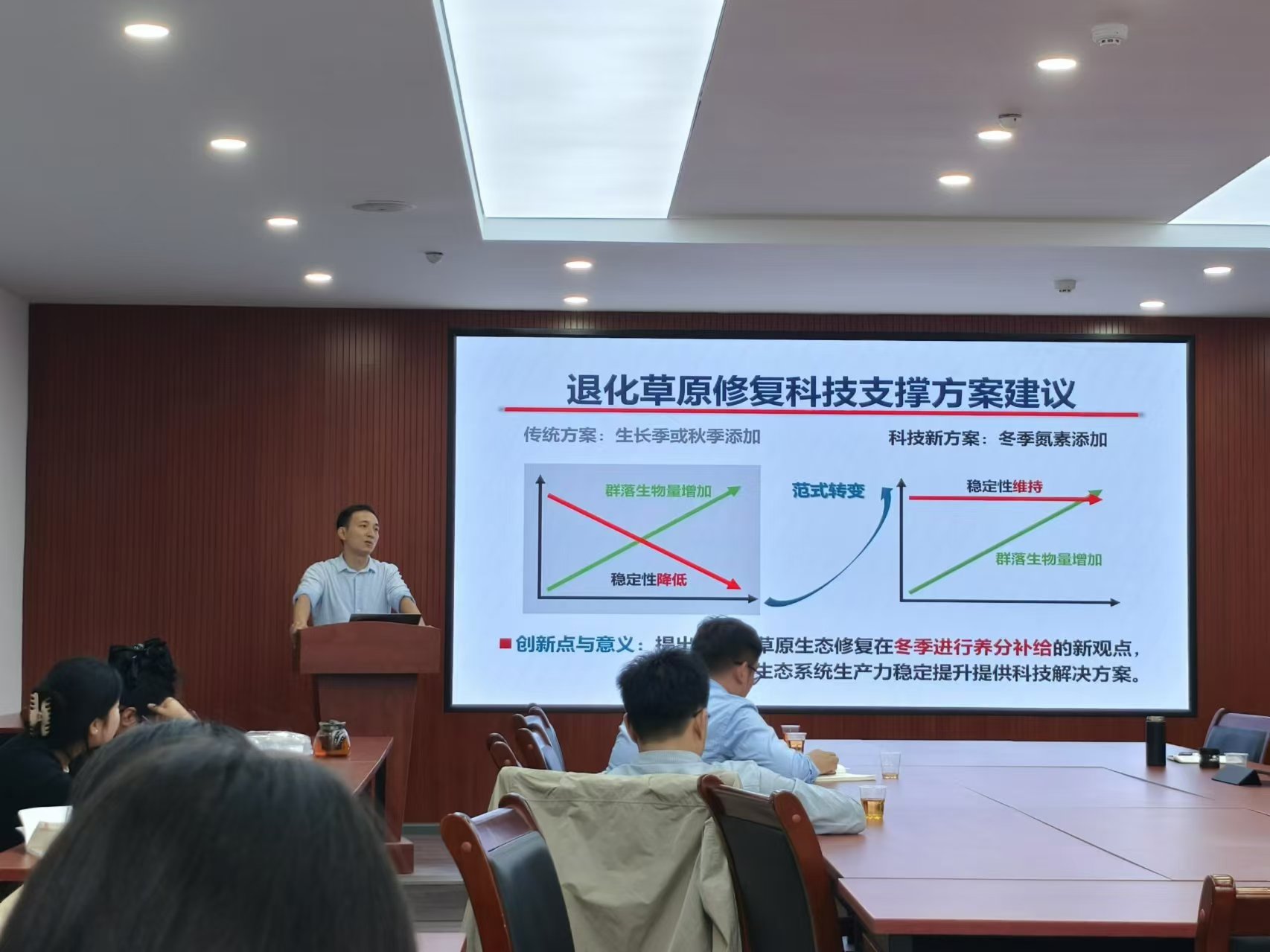 交流会上,张云海研究员结合国家政策发展与自己的研究成果,作了题为“氮富集对退化天然草原质量和稳定性的影响”的学术报告,,从我国草原生态系统现状、国家针对“提升生态系统质量和稳定性”政策发展、国家站的建立与发展、内蒙古草原氮沉降野外实验的开展几个方面与大家交流,系统阐述了氮富集对退化天然草原质量和稳定性的影响,提出草原修复科技支撑方案建议