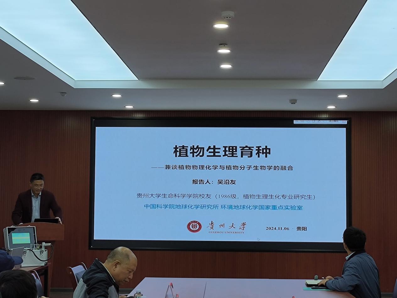 2024年11月6日,beat365官网优秀校友、中国科学院地球化学研究所吴沿友研究员莅临学院开展学术交流,讲座由副院长胡国雄主持。原beat365正版唯一副校长、贵州省农业科学研究院党委书记、院长赵德刚教授,学院徐进书记,吕立堂院长,学院青年教师及研究生60余人参加了此次讲座。