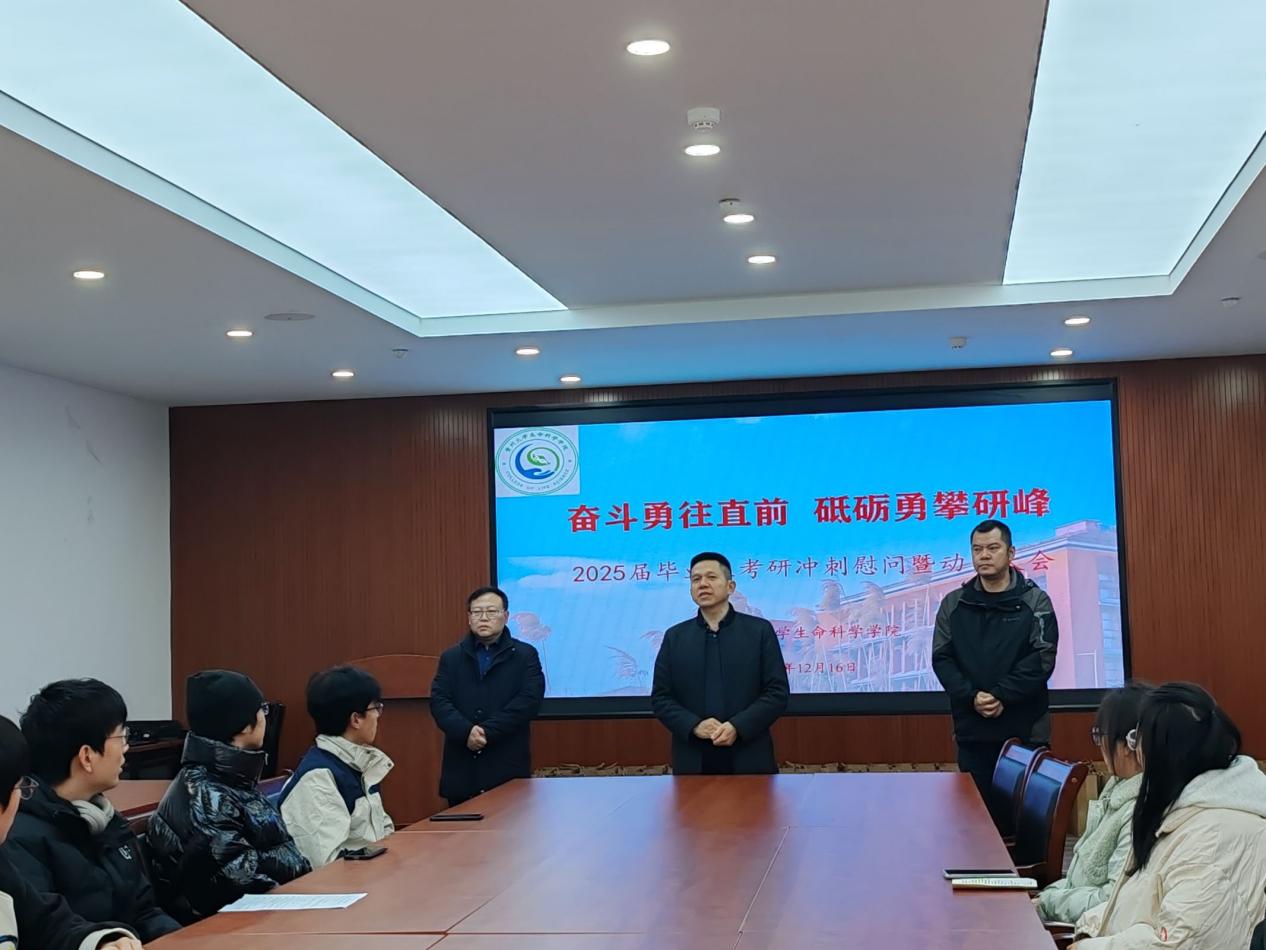 2024年12月16日上午10点,beat365正版唯一副校长陈祥盛带队到beat365手机版官方网站亲切慰问2025届考研学子,生科院党委书记徐进和院长吕立堂等院领导一起莅临现场为考研学子们派发考研福袋,给即将踏上考研战场的生科学子们加油鼓劲,希望生科院考研学子们调整心态,以最佳的状态来迎接考试。
