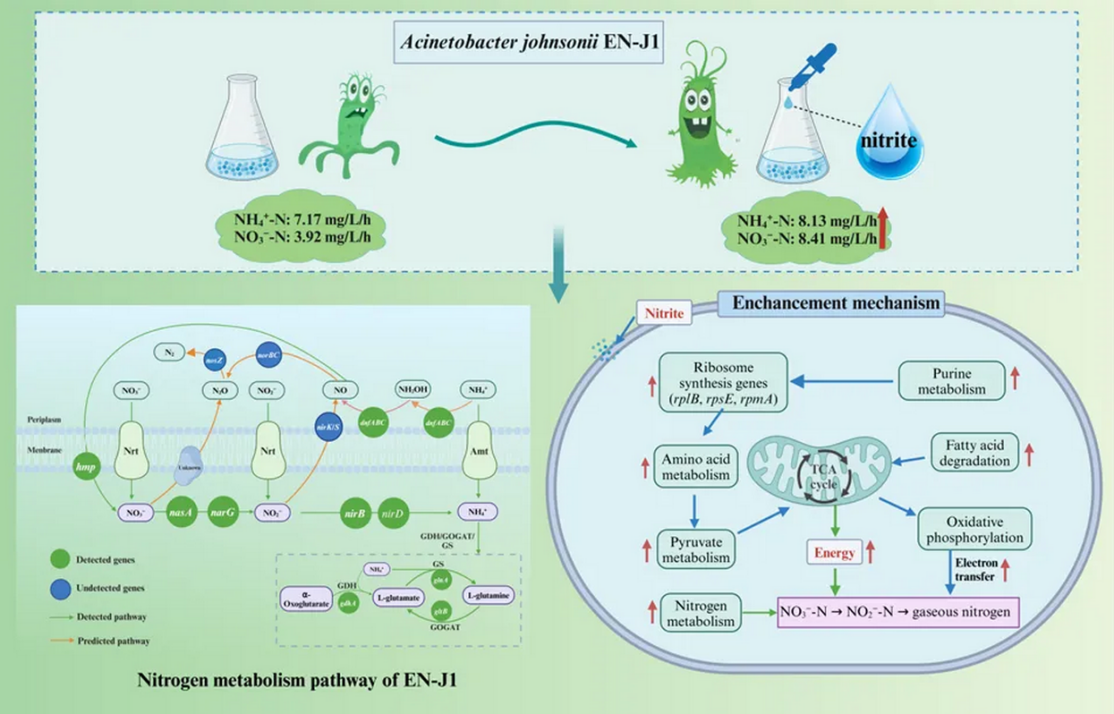 如何阐明亚硝酸盐的添加显著提高了菌株EN-J1的铵态氮和硝酸盐的去除速率这一机理亟待解决。beat365手机版官方网站何腾霞教授团队通过全基因组和转录组测序与分析,发现亚硝酸盐通过调控氮代谢、三羧酸循环和氨基酸代谢等过程,同时提高硝酸还原酶活性、电子传递活性和ATP水平,进而促进微生物的脱氮过程。该发现为阐明亚硝酸盐提升生物脱氮效率的机制提供了重要理论依据,并为优化污水处理工艺提供了新的思路。