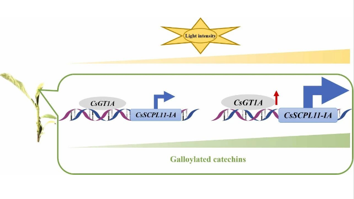这篇论文研究了茶树中Trihelix转录因子CsGT1A通过调控CsSCPL11-IA基因表达促进酯型儿茶素(如EGCG和ECG)生物合成的分子机制及其对光强度的响应。研究首先通过全基因组关联分析(GWAS)在108份茶树种质中筛选到与EGCG含量显著相关的候选基因CsGT1A。该基因属于Trihelix转录因子家族,亚细胞定位显示其定位于细胞核。相关性分析表明,CsGT1A的表达水平与酯型儿茶素(EGCG、ECG)含量呈显著正相关,但与非酯型儿茶素(如EC、EGC)无显著关联。研究揭示Trihelix转录因子通过CsGT1A-CsSCPL11-IA模块调控酯型儿茶素生物合成的分子机制,并阐明该模块在光响应中的关键作用。